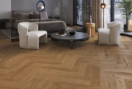 Eine Eichendiele mit stark ausgeprägten Holzmerkmalen und einem angenehmen warmen Braunton. Der Boden wurde zur Betonung von Struktur und Form gebürstet und gefast. Mattlackiert.