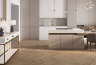 Ein Holzfußboden mit stark gebürstet Struktur, mit vielen natürlichen Holzmerkmalen. Die Dielen wurden mit einer 4-seitigen Mikrofase veredelt. Der Fußboden ist beige und aschefarben gefärbt, mattlackiert.
