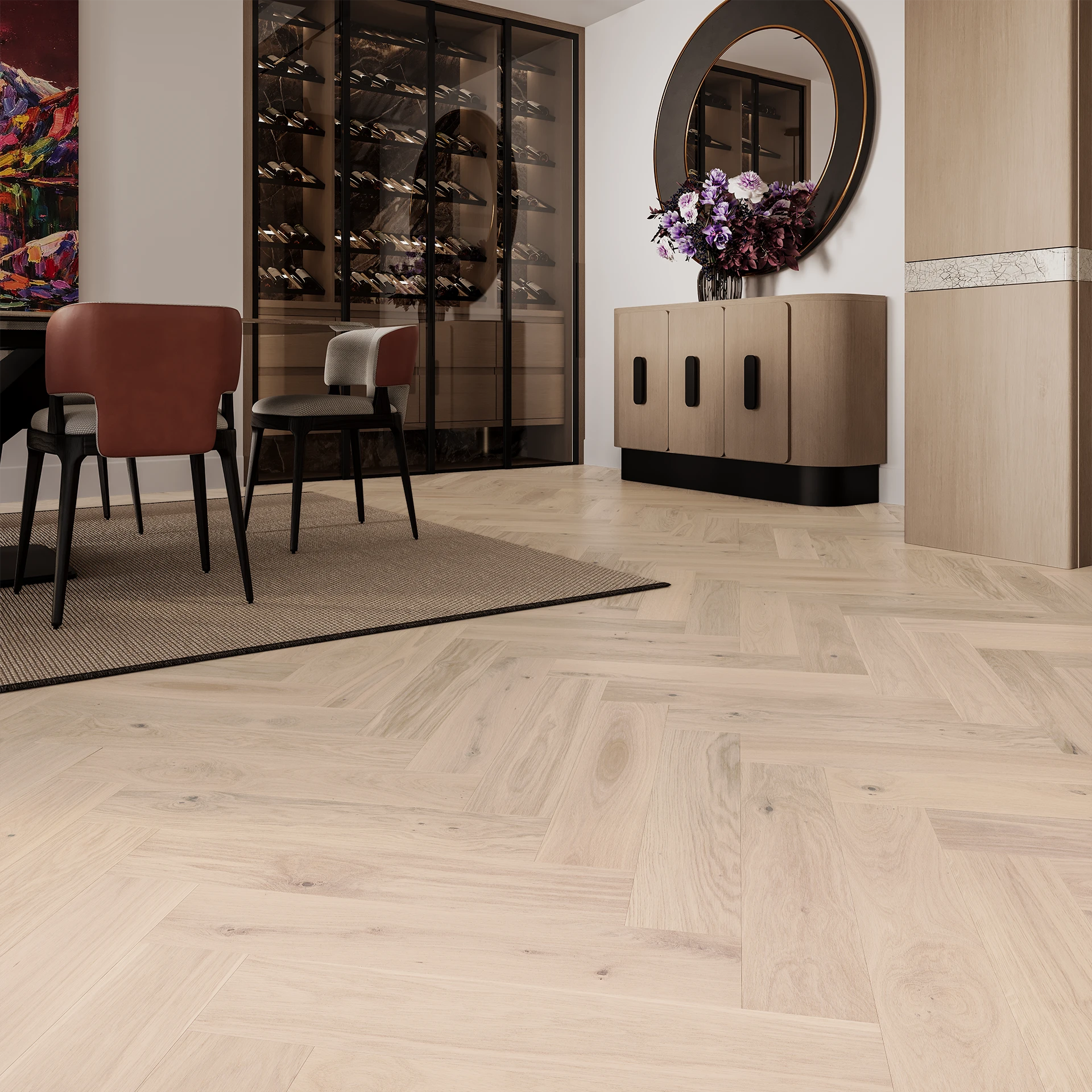 Eichenparkett mit einer feinen cremeweißen Farbe. Die Holzdielen wurden durch Bürsten veredelt und mattlackiert.